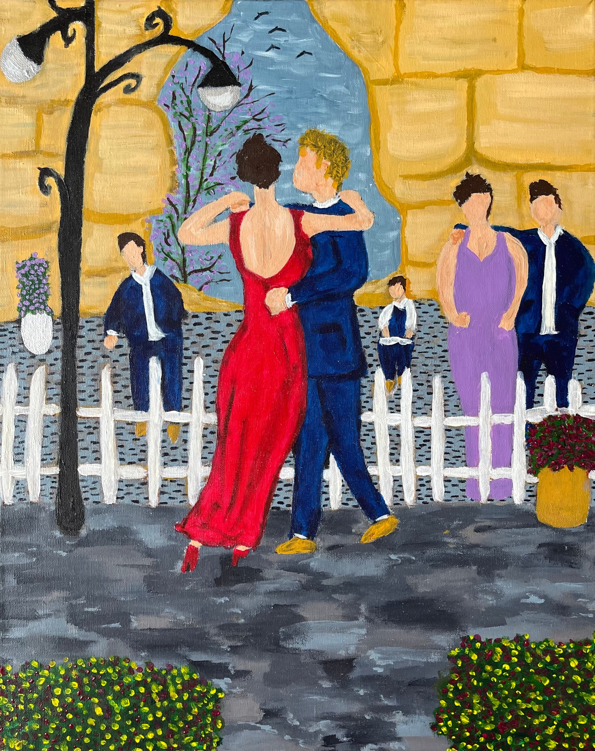 Moments Made To Last is an acrylic piece inspired by a couple dancing at an event with their friends and family watching. A warm piece.
